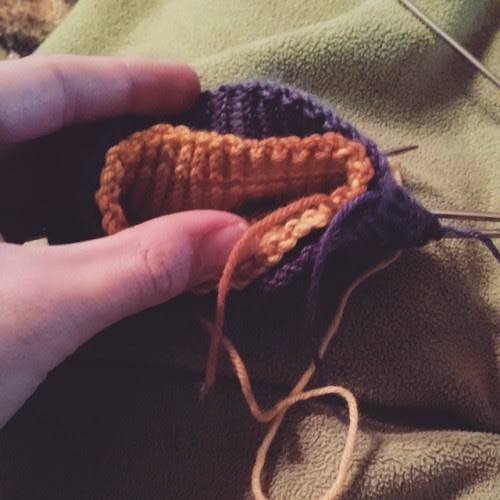 I am working on my sock inside sock again after a bit of a break. I find the going back and forth tiresome, and the entire process is slow. I think I prefer knitting one sock at once, though having the socks perfectly mirrored is nice. And it is a cool party trick. These socks are for a friend who asked for some a long time ago. They may not be done by her birthday, but I am trying.